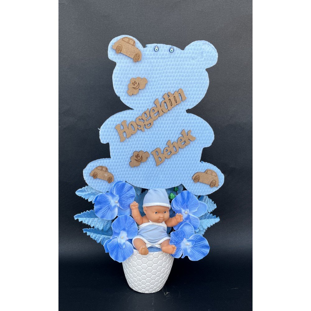 Bu özel yapay çiçek, minik erkek bebeği ve sevimli ayıcık figürüyle her alanda şirin bir atmosfer yaratacak. Strafor detaylarıyla zarif ve dayanıklı bir tasarım sunan bu çiçek, evinize hem neşeli hem de estetik bir dokunuş katacak.