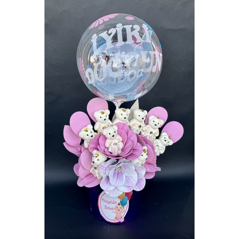 Bu tatlı yapay çiçek, sevimli bir ayıcık ve şeffaf balonla süslenmiş minik kız bebeğiyle evinize renk ve neşe katacak. Hem eğlenceli hem de zarif detaylarıyla her alanda göz alıcı bir dekorasyon parçası olacak.