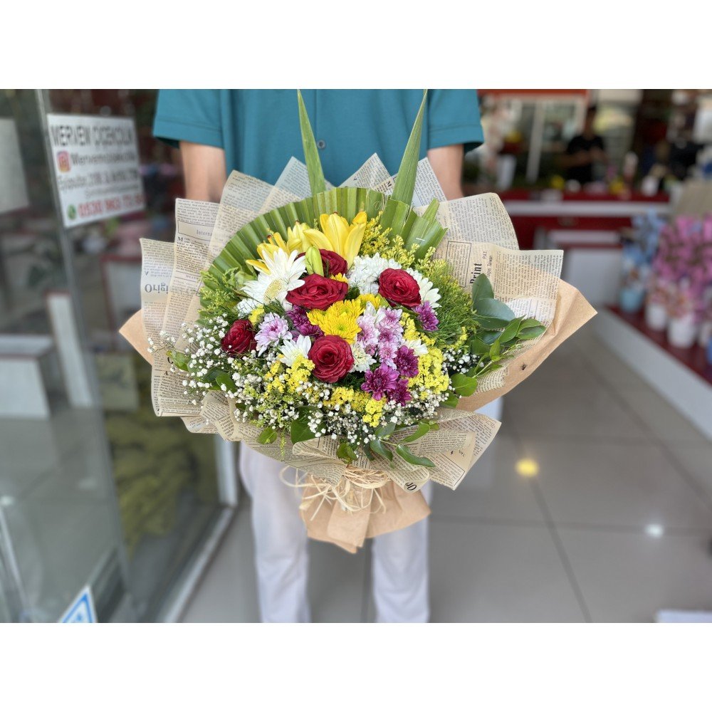 Vintage gazete dokusu ve kahverenginin sıcak tonlarıyla sarılmış bu şık buket, doğal ve zarif bir görünüm sunar. Sade şıklıktan hoşlananlar için ideal bir seçim.”